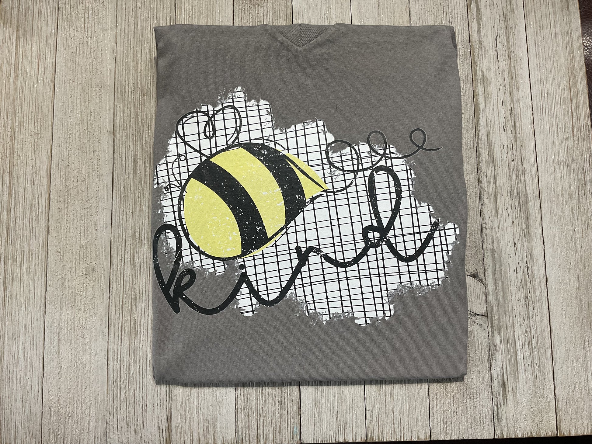 This Gray Bee Kind V Neck Graphic T-shirt features a cute bumble bee graphic and a message to "spread kindness." Made with a comfortable V-neck design, this tee is perfect for promoting positivity and looking stylish. Made with soft fabric, it's ideal for everyday wear.