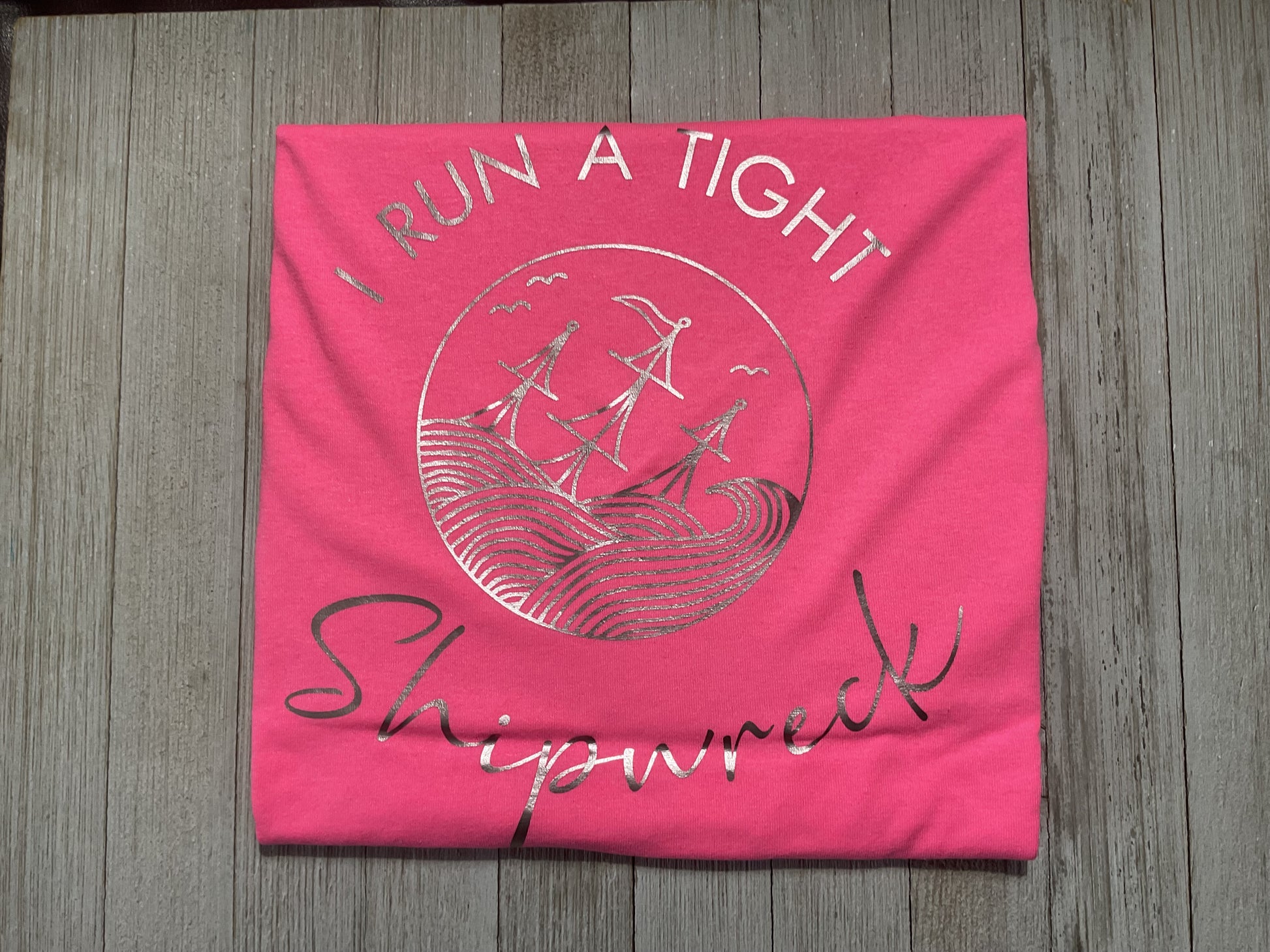 "Stay organized while looking stylish in our I Run A Tight Shipwreck Graphic T. With its vibrant pink color, this T-shirt is perfect for those days when you need an extra boost of motivation to get everything done. Show off your efficiency and productivity with this comfortable and unique shirt."